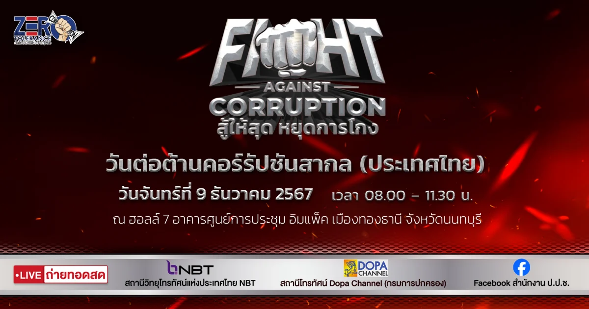 รัฐบาลร่วมกับสำนักงาน ป.ป.ช. สำนนักงาน ป.ป.ท. องค์กรต่อต้านคอร์รัปชัน (ประเทศไทย) ภาคีเครือข่ายทุกภาคส่วน กำหนดจัดงานวันต่อต้านคอร์รัปชันสากล (ประเทศไทย) ในวันจันทร์ ที่ 9 ธ.ค.67 เวลา 08:00 – 11:00 น. ณ ฮอลล์ 7 อาคารศูนย์การประชุม อิมแพ็ค เมืองทองธานี จ.นนทบุรี พร้อมกันทั้งในส่วนกลางและภูมิภาค เพื่อแสดงเจตนารมณ์ของผู้นำทางการเมืองที่ร่วมกับภาคีทุกภาคส่วน มุ่งมั่นในการแก้ไขปัญหาการทุจริตอย่างต่อเนื่อง และปลุกกระแสสังคมที่ไม่ทนต่อการทุจริต มุ่งยกระดับค่าดัชนีการรับรู้การทุจริต (CPI)