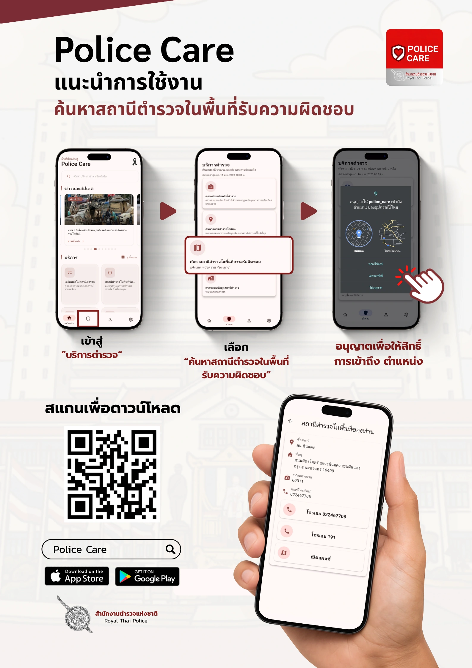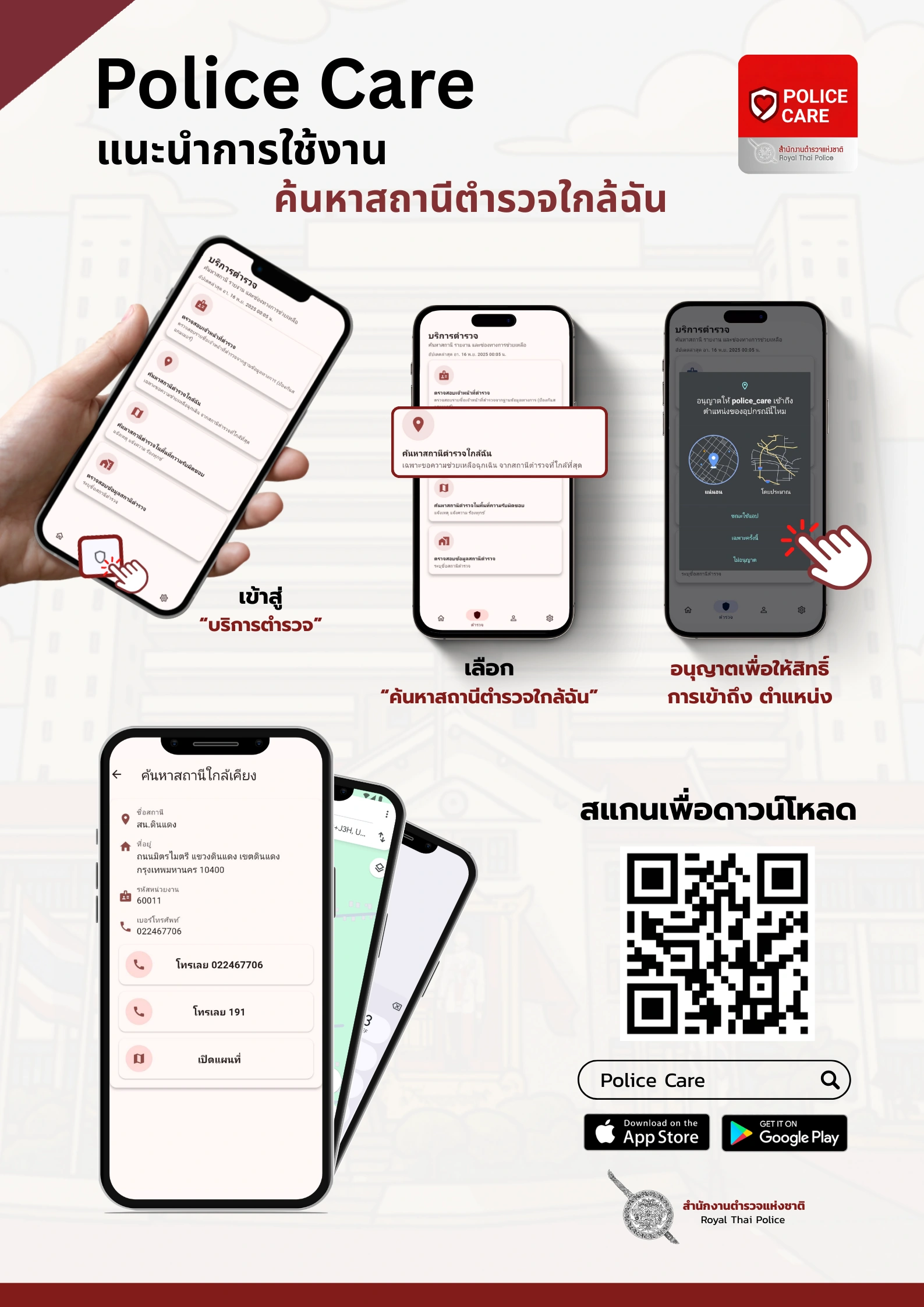 แอปพลิเคชันเพื่อบริการแก่ประชาชน รวมข้อมูลข่าวสารและเข้าถึงข้อมูลบริการสำคัญของสำนักงานตำรวจแห่งชาติได้รวดเร็ว และปลอดภัย ในแอปพลิเคชันเดียว มีฟังก์ชั่นหลากหลาย อาทิ คู่มือการแจ้งความ, ค้นหาสถานีตำรวจพื้นที่เกิดเหตุ, ตรวจสอบข้อมูลทางคดีและใบสั่งจราจร, ตรวจสอบตำรวจปลอม, กฎหมายต้องรู้, คู่มือการขออนุญาต, แจ้งอายัดบัญชี